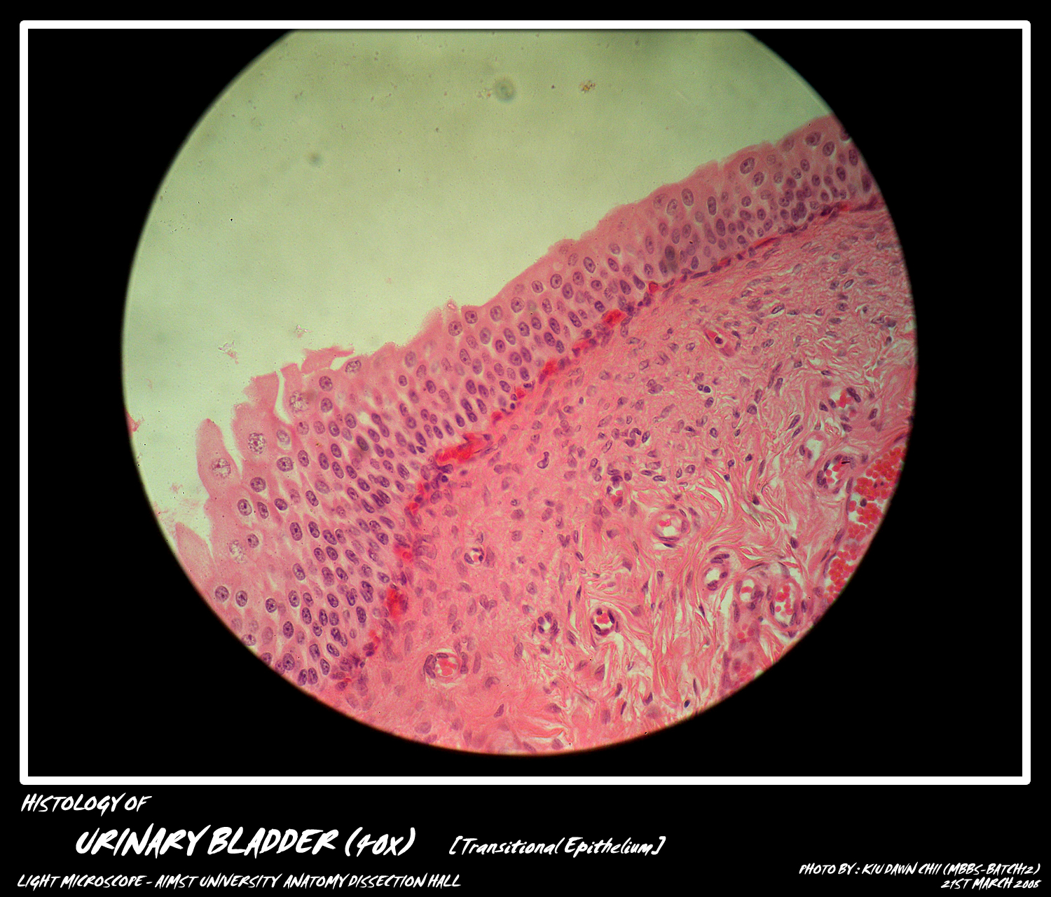 Histology · bladder layers are mucosa (urothelium, lamina propria, discontinuous muscularis mucosa), muscularis propria, adventitia, serosa / peritoneum at dome .
